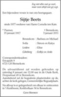 Sijtje Beets, geb. te Purmerend [nh] op 15 jan 1917, ovl. te Bennekom [ge] op 3 jan 2011, begr. te Bennekom [ge] op 8 jan 2011.