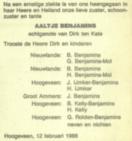| in Parenteel van Fake Booij Aaltje Benjamins, geb. te Hoogeveen [dr] op 13 mrt 1914, ovl. te Hoogeveen [dr] op 12 feb 1988. |
