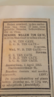 | in Parenteel van Abraham ten Cate Hendrik Willem ten Cate, geb. te Amsterdam [nh] op 18 apr 1855, koopman en makelaar in tabak, ovl. te Amsterdam [nh] op 4 apr 1913 (nazien!), begr. te Amsterdam [nh] Zorgvlied a/d Amsteldijk op 8 apr 1913 11.30. |