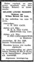 Fam. adv. coll. CBG, Ten Cate, blz. 98, 99: Eenige en algemeene/ kennisgeving/ De uitgestelde crematie/ van wijlen onze Moeder en/ Zuster/ Helene Hubertine/ Elisabetha ten Cate/ zal plaats vinden Maandag/ 17 December a.s. te 14.30/ uur (aankomst trein Drie-/ huis-Westerveld te 14.11/ uur)./ Leiden./ H.L. ten Cate Brouwer./ L.M. ten Cate Brouwer./ Schellingwoude,/ W.B. ten Cate Brouwer./ Amsterdam,/ C.E. ten Cate./ Leiden,/ Wassenaarscheweg 2. (1946).