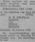 Gerredina ten Cate, geb. te Sneek [fr] op 13 mei 1878. (Fam. adv. coll. CBG, Ten Cate, blz. 46, 73), ovl. te Sneek [fr] (vlg. fam. adv. Enschede) op 24 okt 1918, begr. te Enschede [ov] op 28 okt 1918 ten 13.30. |
