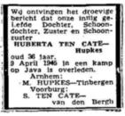| in Parenteel van Abraham ten Cate Huberta Hupkes, geb. te Arnhem [ge] op 2 jul 1908, ovl. te Bandoeng [jb, Indonesië] (Tjihapit, vrouwen jappenkamp) op 9 apr 1945, begr. te Bandoeng [jb, Indonesië] Begraafplaats Nederlands ereveld Pandu, Vak IV, nr. 476 (oorlogsgravenstichting gedenkboek). |