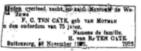 Idem: Zij die iets te vorderen hebben van den Heer Mr. G.P. ten Cate/ hier kortstondig gewoond hebbende doch onlangs naar Indië vertrokken/ en hunne rekening nog niet inzonden, worden uitgenoodigd zulks te/ doen bij ondergeteekende; zullende betaling zoo spoedig mogelijk volgen./ van Swieten,/ gepd. Majoor derKavalerie./ Leyden, 5 November 1866.