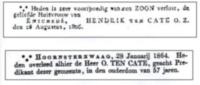 Hendrik ten Cate, zn. van Othmar ten Cate (burgemeester van Enschede) en Hermina Hoedemaker, geb. te Enschede [ov] op 26 aug 1780, ged. DG te Enschede [ov] in 1800, fabrikeur rentenier in 1833, lid der gem. raad van Enschede (1838). (Fam. adv. coll. CBG, Ten Cate, blz. 32), ovl. te Enschede [ov] op 20 feb 1858, tr. (1) met Catharina Juliana Ernesta Buch (Bach?). Uit dit huwelijk één zoon. tr. (3) met zijn nicht Geertruid ten Cate, dr. van Herman ten Cate (koopman en fabrikant) en Maria Geertruid Hoedemaker. Uit dit huwelijk één kind. tr. (4) met Gezina Buddeke (Budde). Uit dit huwelijk 9 kinderen. otr. (2) te Enschede [ov] op 20 jul 1804 (vlg. fam. adv. Sneek 21, 24-7-1804), tr. te Sneek [fr] op 26 aug 1804 (andere opgaaf 6-8-1804) met