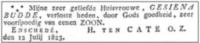 Gezina Buddeke (Budde), dr. van Barend Buddeke (kleermaker te Gildehaus) en Johanna Huijbers, geb. te Gildehaus [ni, Duitsland] op 2 mrt 1795. (Fam. adv. coll. CBG, Ten Cate, blz. 25), ovl. te Enschede [ov] op 9 jul 1847.