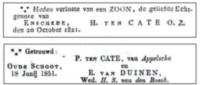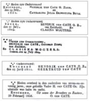 Hendrik ten Cate, zn. van Othmar ten Cate (burgemeester van Enschede) en Hermina Hoedemaker, geb. te Enschede [ov] op 26 aug 1780, ged. DG te Enschede [ov] in 1800 Palmzondag, fabrikeur rentenier in 1833, lid der gem. raad van Enschede (1838). (Fam. adv. coll. CBG, Ten Cate, blz. 32), ovl. te Enschede [ov] Langestraat nr. 172 op 20 feb 1858 ten 08.00, tr. (1) met Catharina Juliana Ernesta Buch (Bach?), dr. van Carel Lodewijk Buch en Augusta Regina Juliana Frederici. Uit dit huwelijk één zoon, tr. (2) met Clasina Wouters, dr. van Barend Wouters en Elkje Posthumus. Uit dit huwelijk 3 kinderen, tr. (3) met zijn nicht Geertruid ten Cate, dr. van Herman ten Cate (koopman en fabrikant) en Maria Geertruid Hoedemaker. Uit dit huwelijk één kind. |  |