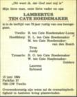 | in Parenteel van Abraham ten Cate Lambertus ten Cate Hoedemaker, geb. te Deventer [ov] op 13 okt 1914, commies gem. arch. Den Haag. Lambertus gaat op 10 nov. 1948 naar Den Haag, ovl. te Voorst [ge] (Twello) op 13 jun 1994, gecr. |