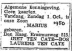 Marius ten Cate, zn. van Laurens ten Cate (bankier te Groningen, eerder zeepzieder (1883) en kunstmesthandelaar) en Cornelia Gerhardina Sanders, geb. te Lochum [ge] op 20 jul 1892, arts te Bolsward (grootmeester Vrijmetselaars), ovl. te Amsterdam [nh] op 29 dec 1983, tr. te Bolsward [fr] op 9 mei 1921 (huw. akte nr. 12) met