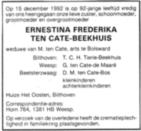 (fam. adv. coll. CBG, Ten Cate, blz. 113). Ernestina Frederika Beekhuis woont ca. 1990 te Bilthoven. Een kwartierstaat van haar ingevoerd tot de 7e generatie.