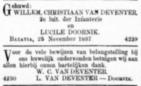 | in Parenteel van Abraham ten Cate Willem Christiaan van Deventer, geb. te Semarang [jt, Indonesië] (Salatiga) op 11 nov 1860 (RA 1862/37), kapt. inf. KNIL, ovl. te Batavia [ja, Indonesië] op 12 aug 1915 (RA 1916/238). |