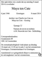 | in Parenteel van Abraham ten Cate Maja (Maya) ten Cate, geb. te Nijmegen [ge] op 6 feb 1946, medewerkster Mamamia Kringloopwinkel, ovl. te Groningen [gr] op 8 mrt 2014, gecr. te Groningen [gr] Crematorium Groningen op 18 mrt 2014. |
