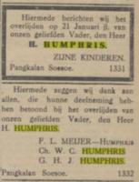 Henry (Harry) Humphris, geb. te Amoy [China] op 16 feb 1854, employé BPM Sumatra, ovl. te Pangkalansusu [sm, Indonesië] op 2 jan 1924, begr. te Pangkalan Brandan [sm, Indonesië], tr. circa 1895 met