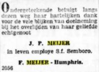 Johannes Petrus Meijer, zn. van Johannes Petrus Meijer en Wilhelmina Antoinette Pijpaert, geb. te Kota Radja [sm, Indonesië] op 11 apr 1888, employé Petrol. Mij. te Pangkalan Brandan (1915) Mach. Suikerfabriek Kawarasan te Kediri (1917), idem Tegowangi, Paree (1919), idem Blimbing, Djombang (1920), idem Soemberdadi, Kediri (1924), idem Djatiroto, Djatiroto (1930), Semboro (1931), ovl. vermoedelijk te Semboro [ja, Indonesië] kort voor 17 feb 1931, tr. te Penang [sm, Indonesië] op 31 jul 1914 Ingeschreven huwelijk gesloten te Penang op den 31 Juli 1914 tusschen Johannes Petrus Meyer met Janny Louisa Humphris met