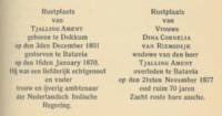 Tjalling Ament, geb. te Dokkum [fr] op 3 dec 1801, resident van Cheribon, directeur der producten en civiele magazijnen te Batavia, ovl. te Batavia [ja, Indonesië] op 16 jan 1870. |