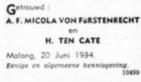 Antoine Louis ten Cate, zn. van Pieter Lodewijk ten Cate (controleur Binnenl. Bestuur te Tjiribon (Cheribon), later Assistent-Resident van Koeningan) en Wilhelmina Henriëtte Bekking, geb. te Soerabaja [ji, Indonesië] Soerabaja Ned Indië [NI] op 26 jul 1886, employé suikerfabr. Djatiroto (1931), ovl. te Bandoeng [jb, Indonesië] Soekamiskin gevangenis op 24 mei 1945, begr. te Bandoeng [jb, Indonesië] Nederlands ereveld Pandu Vak IV Nummer 447 (bron: gedenkboek oorlogsgravenstichting), tr. (2) met Henriëtte Wilhelmina Theodora Françoise (Mieneke) Johan. Uit dit huwelijk geen kinderen, tr. (3) met Rosaline Agnetta van Zegen. Uit dit huwelijk 2 kinderen. |  |