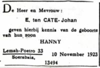 Hanny (Hans) ten Cate, zn. van Ernst ten Cate (eigenaar Sigaren & Tabakshandel 'Oost-Java', Kaliasin 45, Soerabaja) en Henriëtte Wilhelmina Theodora Françoise (Mieneke) Johan, geb. te Soerabaja [ji, Indonesië] op 10 nov 1923, station manager KLM te Djakarta; general manager Garuda Airlines, ovl. te Geldrop [nb] op 13 dec 1996, begr. te Geldrop [nb], tr. te Batavia [ja, Indonesië] op 9 aug 1949 fam adv. coll. CBG, Ten Cate, blz. 102: Ondertrouwd:/ H. ten cate/ en/ Z. Meyer/ Huwelijksvoltrekking op 9 Aug. a.s./ bij de Burgerlijke Stand./ Soloweg 9, Batavia met