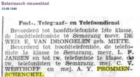 | Agnes Yvonne Prommenschenckel, geb. te Semarang [jt, Indonesië] op 28 jun 1918 (Ind. Alm 1919/109), PR, telefoniste 1e kl. PTT te Semarang (1940), ovl. te Wageningen [ge] op 2 dec 2008, begr. te Renkum [ge] graf nr. B 315, Algemene Begraafplaats Onder de Bomen, Onder de Bomen (ongenummerd, naast nr. 7) 6871 CG. |