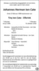 Johannes Hendrikus Joseph (Johan) ten Cate, geb. te Almelo [ov] op 4 jun 1944, RK, landbouwer, ovl. te Wierden [ov] op 30 sep 2012, gecr. te Almelo [ov] crematorium Almelo, Willem de Clercqstraat 95 op 5 okt 2012. |