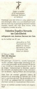 Bernardus ten Cate, geb. te Wierden [ov] op 9 jan 1902, RK, landbouwer en wegwerker bij Rijkswaterstaat, ovl. te Hellendoorn [ov] verpleeghuis Krönnenzommer op 9 feb 1986 Vlg. fam. adv. van zijn overl. woont Bernardus: Dwarsdijk 2, 7641 RL Wierden , begr. te Wierden [ov] op 14 feb 1986. |