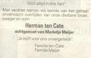 Hermannus Johannes (Herman) ten Cate, geb. te Wierden [ov] op 17 jun 1938, RK, projectleider bij Rossmark - van Wijk & Boerma Waterbehandeling B.V. bijna 40 jaar bestuurslid en de laatste 8 jaar voorzitter van de Onderlinge Verzekering Maatschappij (O.V.M.) 'Wierden en Omstreken' U.A, ovl. te Wierden [ov] op 16 mrt 2004      , begr. te Wierden [ov] gemeentelijke begraafplaats, Vriezenveenseweg, graf nr. P6264642 op 20 mrt 2004. |